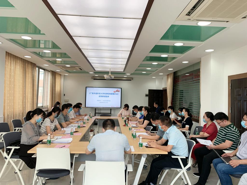 王荣珍副处长介绍了《广东外语外贸大学科研机构管理办法》的制订情况和主要内容,并就目标责任、机构建制、考核任务、合同签订等方面进行了解读。