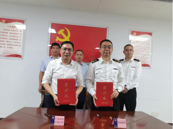刘海春和柳陲分别代表广东外语外贸大学和黄埔海关签约。签约仪式后,与会领导一起为青少年法治教育中心实践基地揭牌。