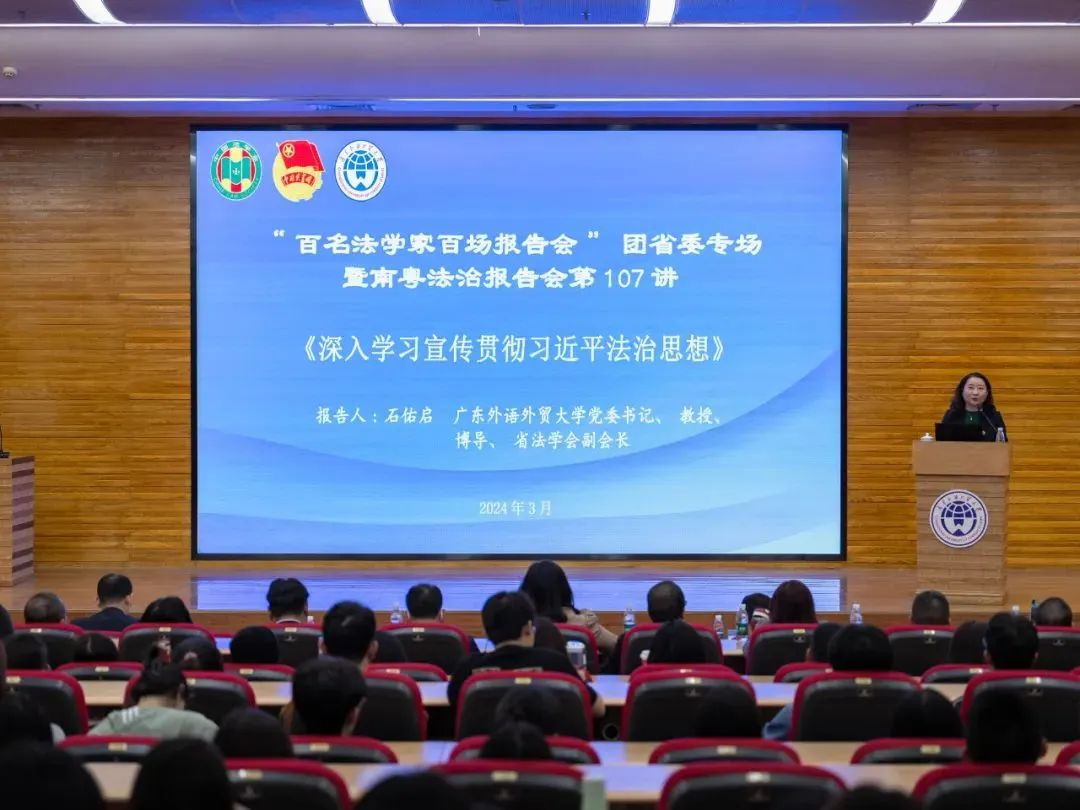 3月21日下午,省法学会、团省委联合在广东外语外贸大学举办“百名法学家百场报告会”团省委专场暨南粤法治报告会第107讲活动。广东外语外贸大学党委书记、省法学会副会长石佑启教授围绕“深入学习宣传贯彻习近平法治思想”主题作专题报告,省法学会专职副会长兼秘书长金艳出席活动并致辞,团省委副书记王浩、广东外语外贸大学党委宣传部部长陈彦辉出席报告会。会议由广东外语外贸大学党委常委、副校长申明浩主持,来自广东外语外贸大学的青年师生、思政课教师、团干部代表200余人参与报告会。