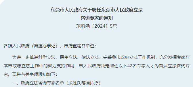 2024年1月10日,东莞市人民政府发布《关于聘任东莞市人民政府立法咨询专家的通知》。我院杨治坤教授担任东莞市人民政府首届立法咨询专家。