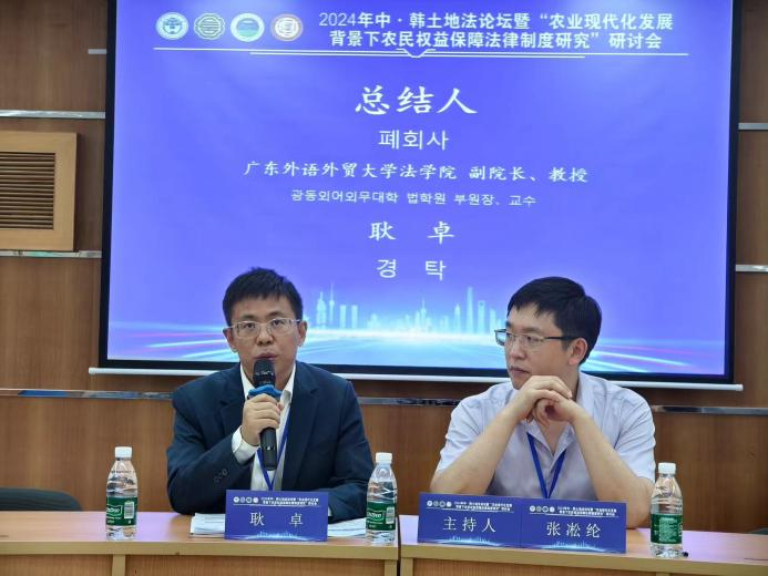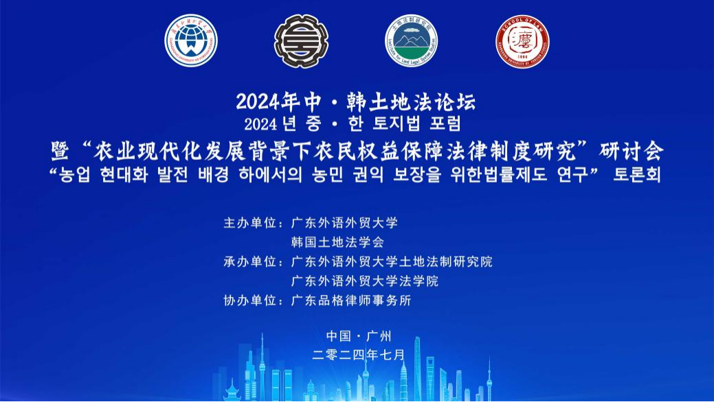 7月20日,2024年中·韩土地法论坛暨“农业现代化发展背景下农民权益保障法律制度研究”研讨会在广东外语外贸大学北校区成功举办。本次会议由广东外语外贸大学、韩国土地法学会主办,广东外语外贸大学土地法制研究院、法学院承办,广东品格律师事务所协办。来自韩国土地法学会、庆熙大学、弘益大学、明知大学、国立江陵原州大学、东亚大学、釜山大学,中国西南政法大学、中南财经政法大学、广州大学、大连海事大学、肇庆学院、广东技术师范学院等省内外高校、科研机构的学者、在校生,以及地方立法机关、律师事务所的专家、实务人士50余人参加了本次会议。